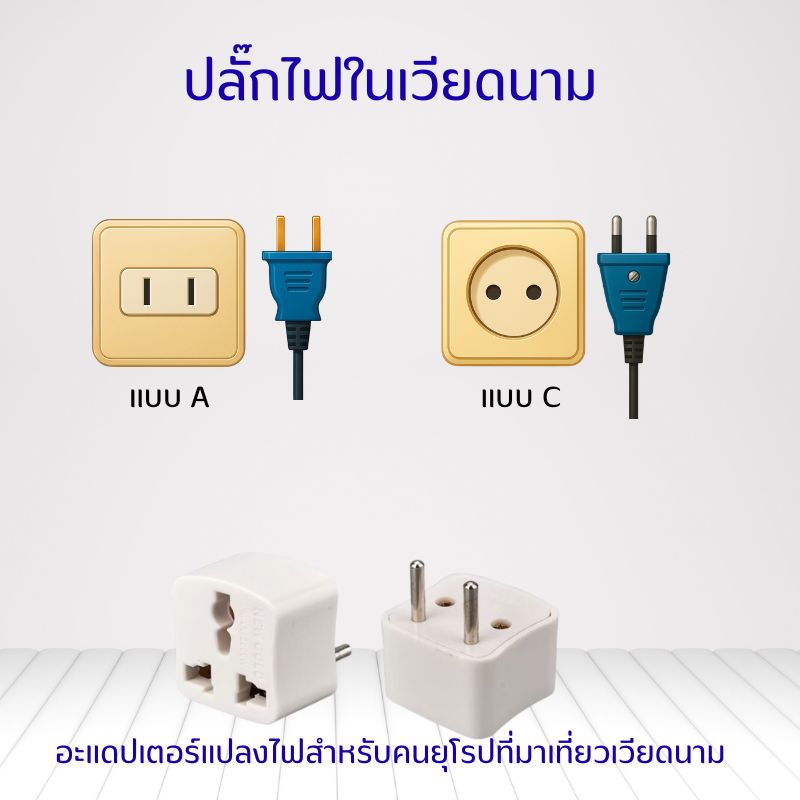 ระบบไฟฟ้าในเวียดนามใช้ ไฟฟ้า 220 โวลต์ เช่นเดียวกับประเทศไทย แต่ปลั๊กส่วนใหญ่เป็นแบบขากลม 2 ขา หรือแบบยูโร (Type C และ Type A)ปลั๊กไฟที่เวียดนามมีหลายประเภท แต่ส่วนใหญ่จะใช้ปลั๊กแบบ A, C, และ E/F. ปลั๊กแบบ A คือปลั๊กแบนสองขา ขาเท่ากันเสียบได้ทั้งสองด้าน, แบบ C คือปลั๊กกลมสองขา และแบบ E/F คือปลั๊กกลมสองขาที่มีขั้วสำหรับสายดิน. แรงดันไฟฟ้ามาตรฐานที่เวียดนามคือ 220V ความถี่ 50Hz.