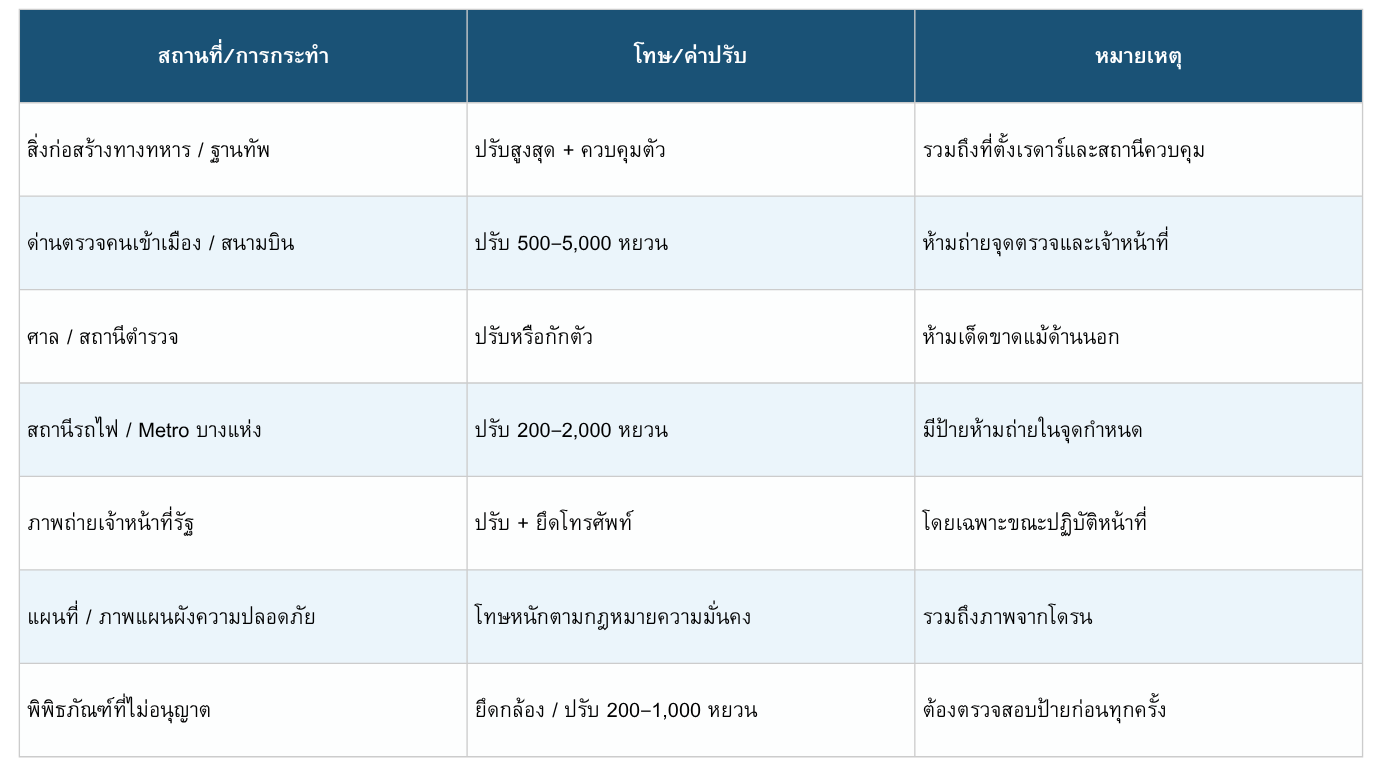 โทษ: อาจถูกควบคุมตัว ยึดอุปกรณ์ถ่ายภาพ และส่งฟ้องดำเนินคดี