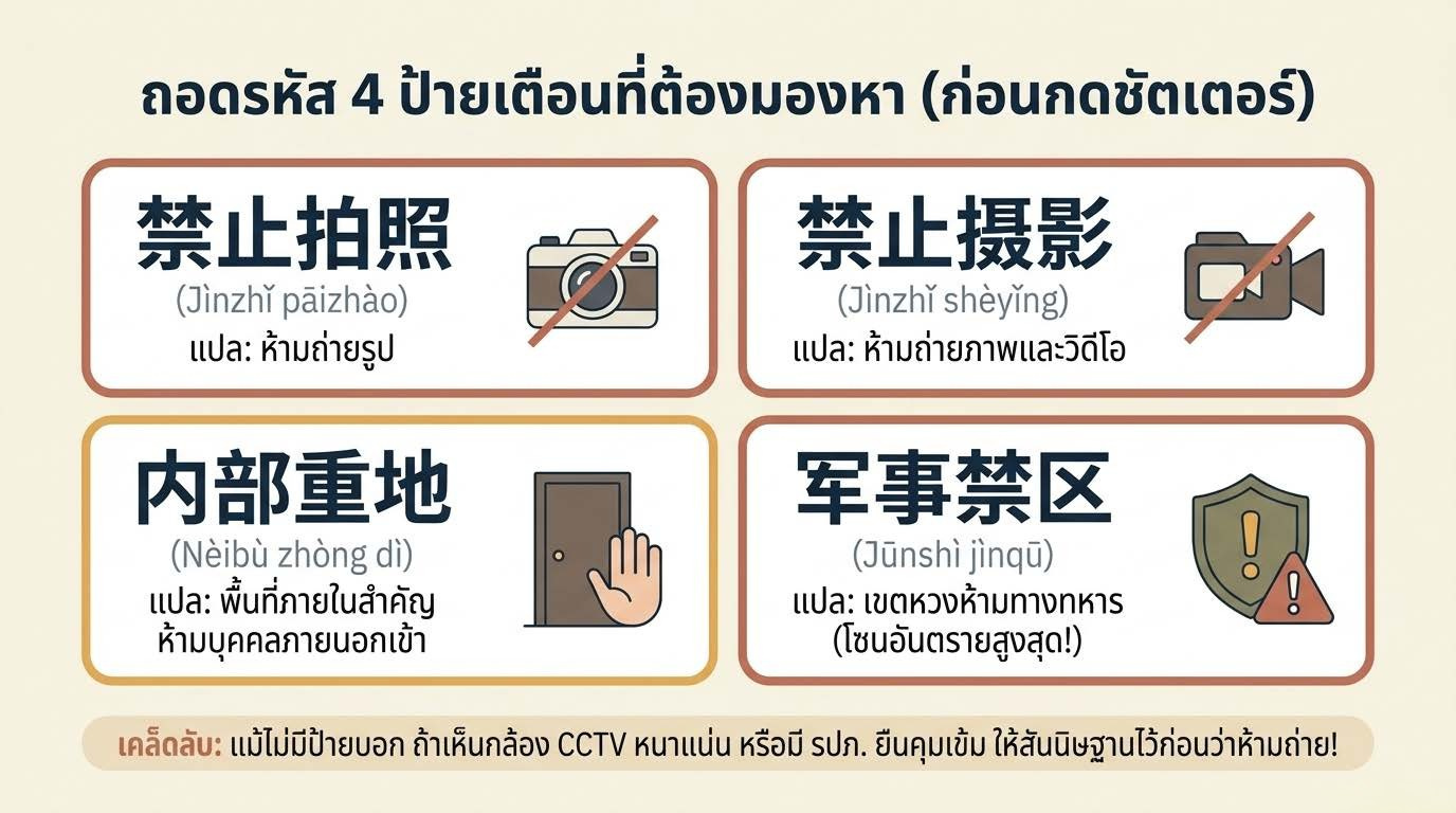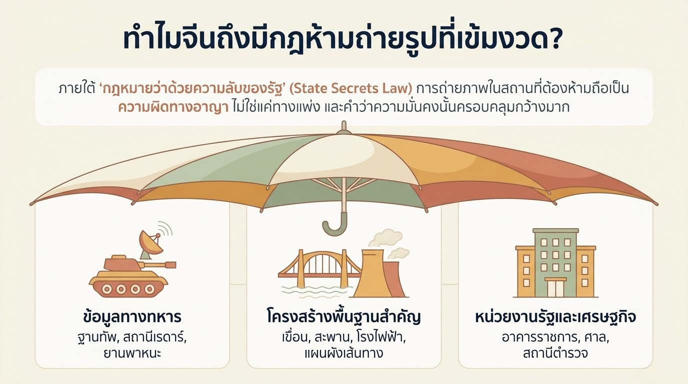 📌 ทำไมต้องอ่านบทความนี้? เพราะกฎหมายความมั่นคงของจีนครอบคลุมกว้างมาก และ "ป้ายห้ามถ่ายรูป" ไม่ได้มีอยู่ทุกที่ นักท่องเที่ยวไทยหลายคนไม่ทราบจนกว่าจะโดนเรียกตรวจ
