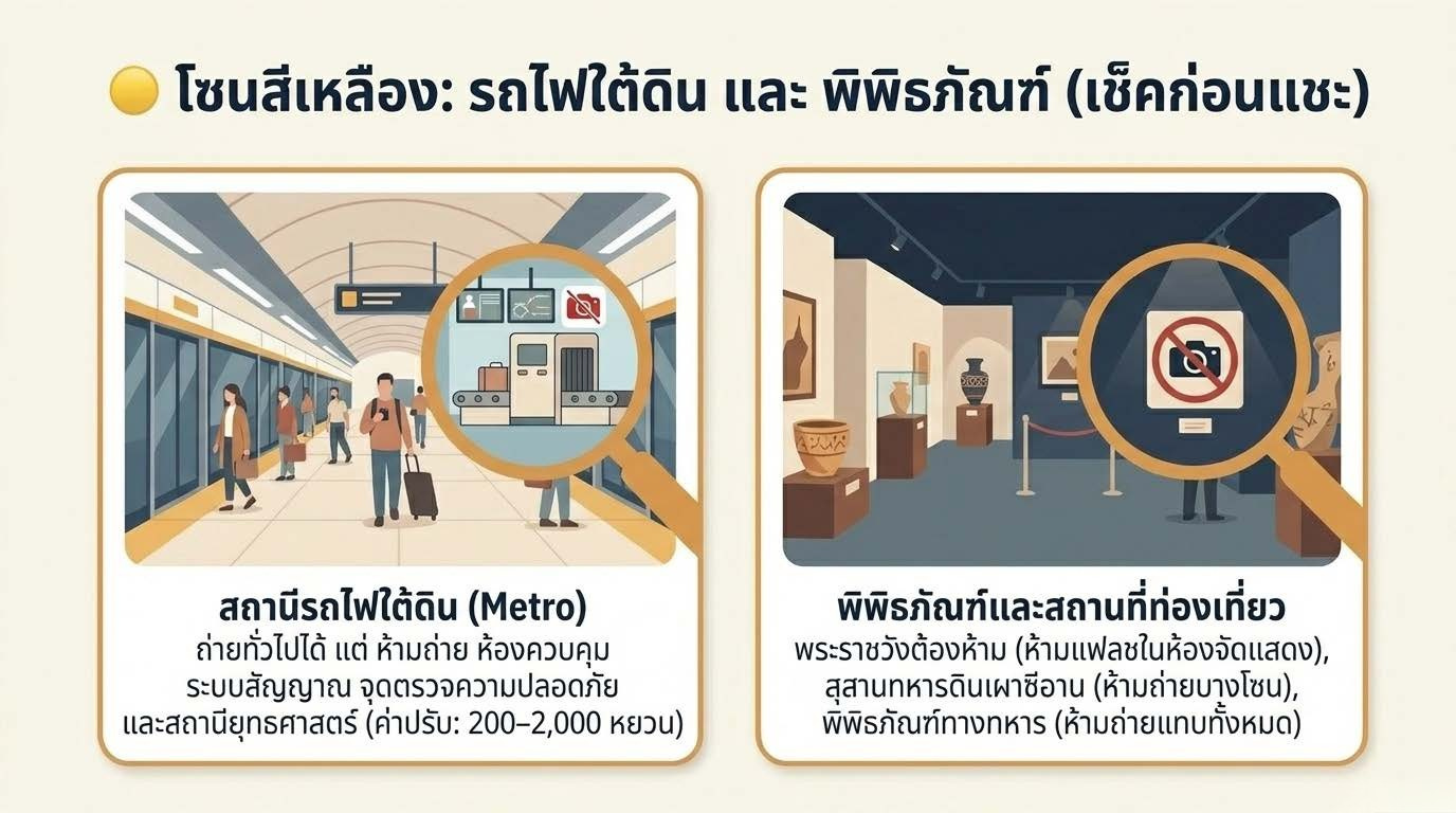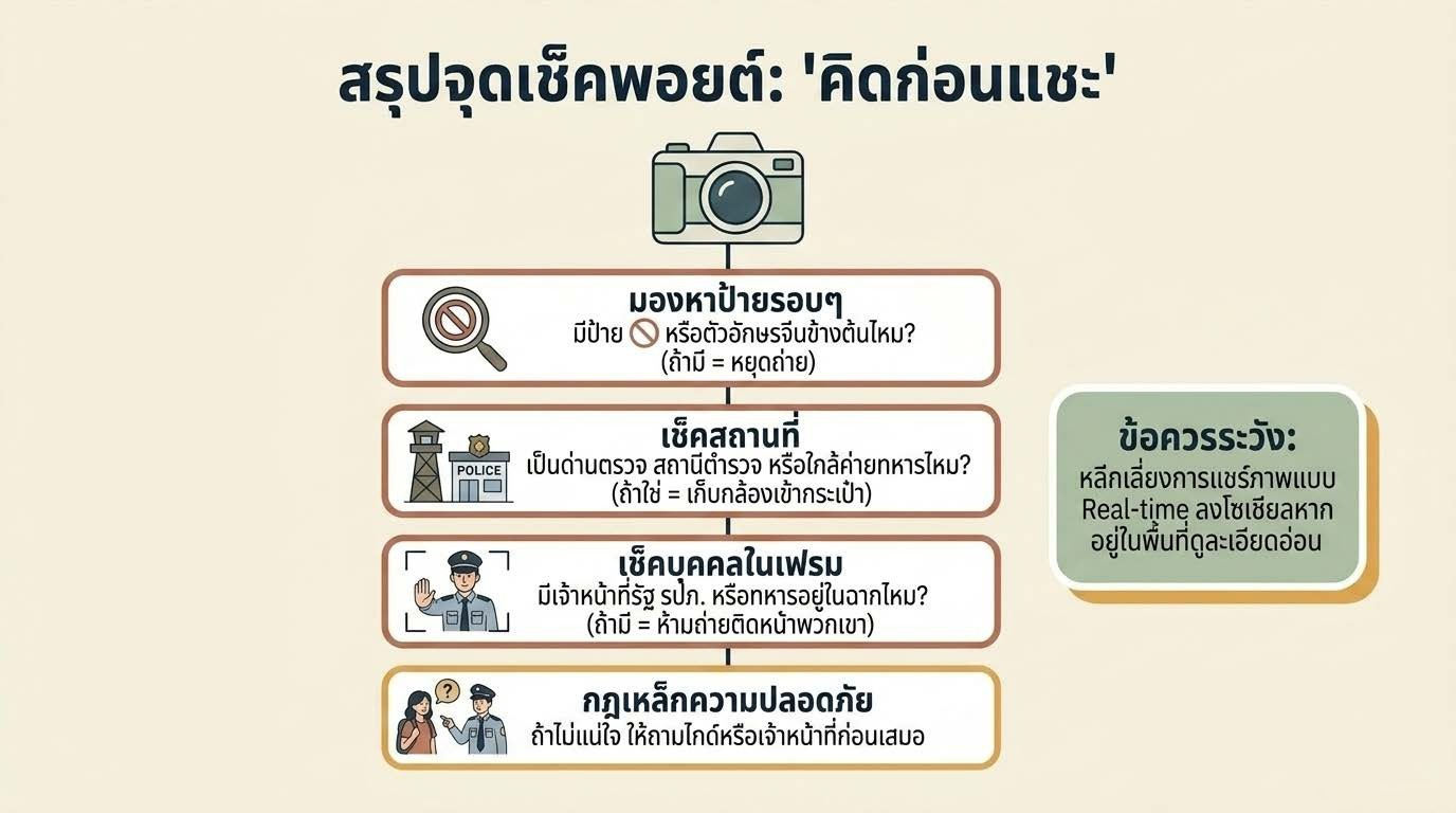 เคล็ดลับ: แม้ไม่มีป้าย ถ้าเห็นเจ้าหน้าที่รักษาความปลอดภัยหรือกล้อง CCTV หนาแน่น ควรระวังและถามก่อนถ่าย