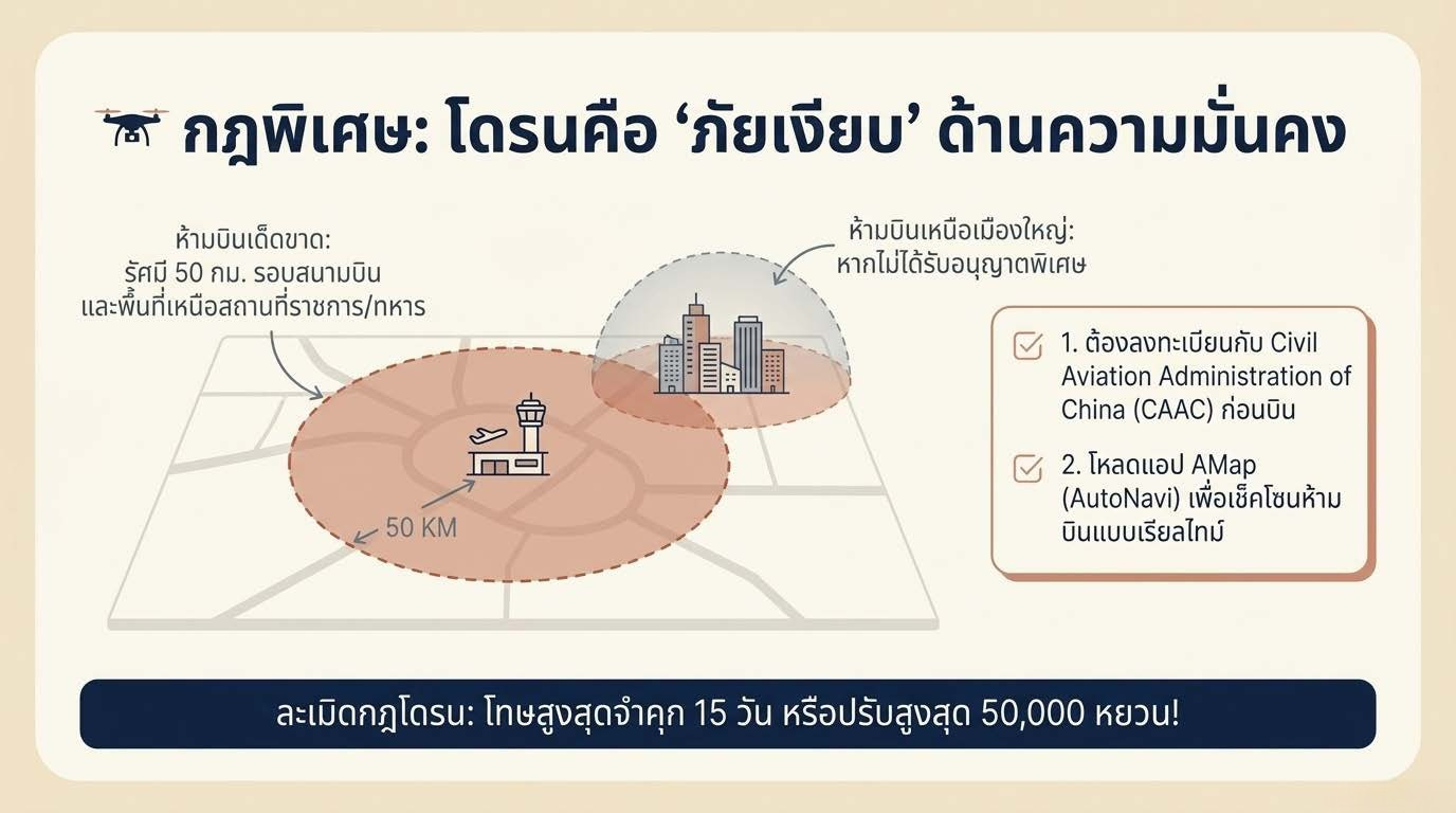 💡 แนะนำ: หากต้องการถ่ายภาพทางอากาศในจีน ควรใช้บริการผ่านบริษัทท่องเที่ยวที่ได้รับอนุญาต หรือเช่าบริการโดรนท้องถิ่นที่มีใบอนุญาต