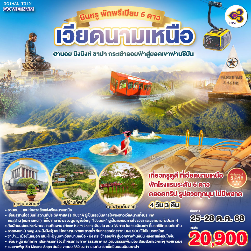 โปรแกรมยอดนิยมได้แก่ ซาปา ฟานซิปัน นิงบิงห์ ฮานอย พร้อมแหล่งท่องเที่ยวสวยๆ อย่าง ทะเลสาบคืนดาบ ถนน 36 สาย และ Moana Café