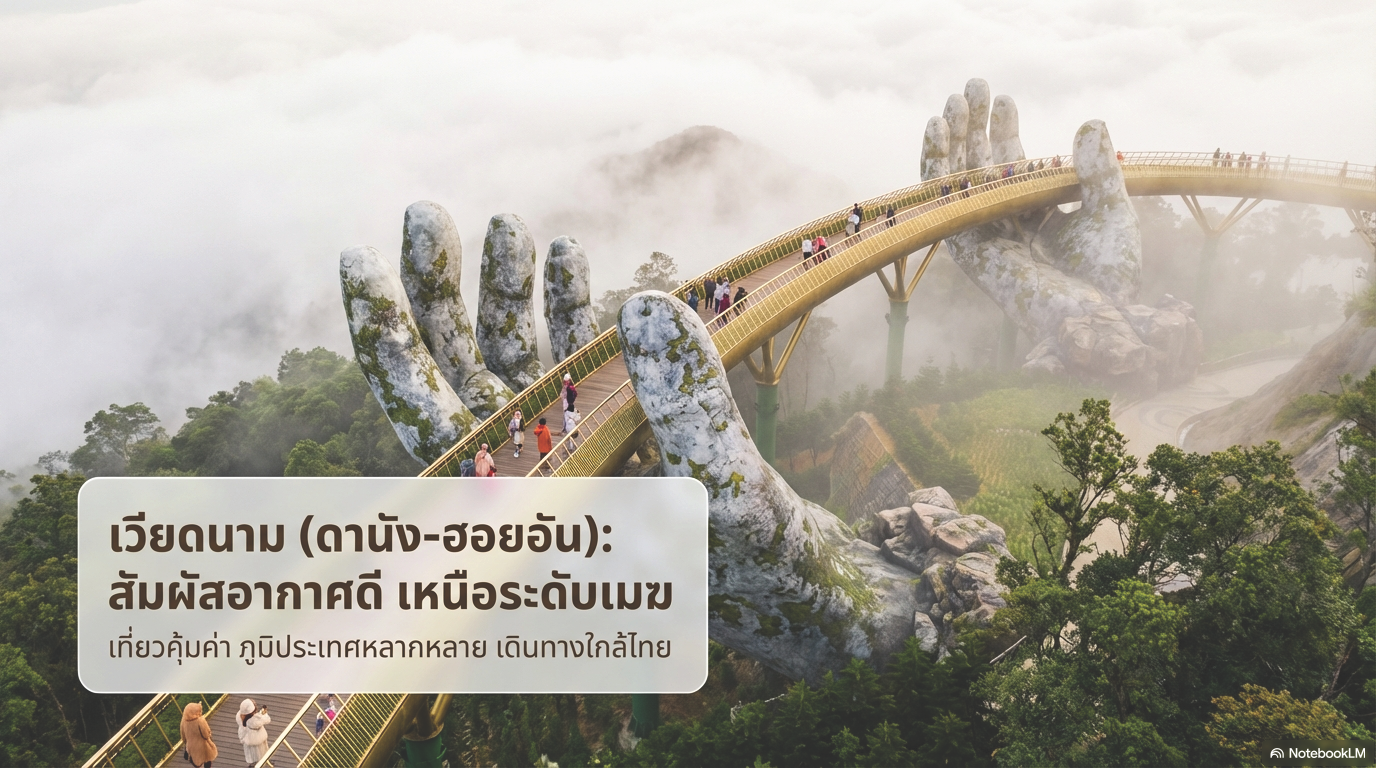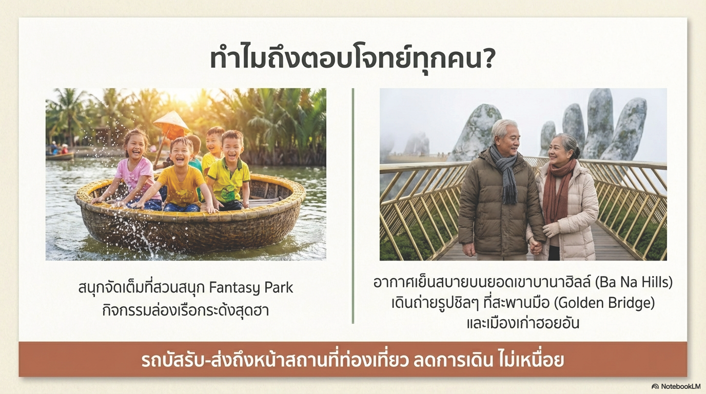 สำหรับครอบครัวที่มีเด็กและผู้ใหญ่ เมืองที่แนะนำเป็นพิเศษคือ ดานัง-ฮอยอัน ค่ะ เพราะที่นี่มี "บานาฮิลล์" (Ba Na Hills) สวนสนุกและหมู่บ้านฝรั่งเศสบนยอดเขาที่ต้องนั่งกระเช้าไฟฟ้าที่ยาวที่สุดในโลกขึ้นไป อากาศด้านบนเย็นสบายตลอดปี ผู้ใหญ่สามารถเดินเล่นถ่ายรูปที่สะพานมือสีทอง (Golden Bridge) ได้อย่างเพลิดเพลิน ส่วนเด็กๆ ก็มีสวนสนุก Fantasy Park ให้เล่นแบบจัดเต็ม