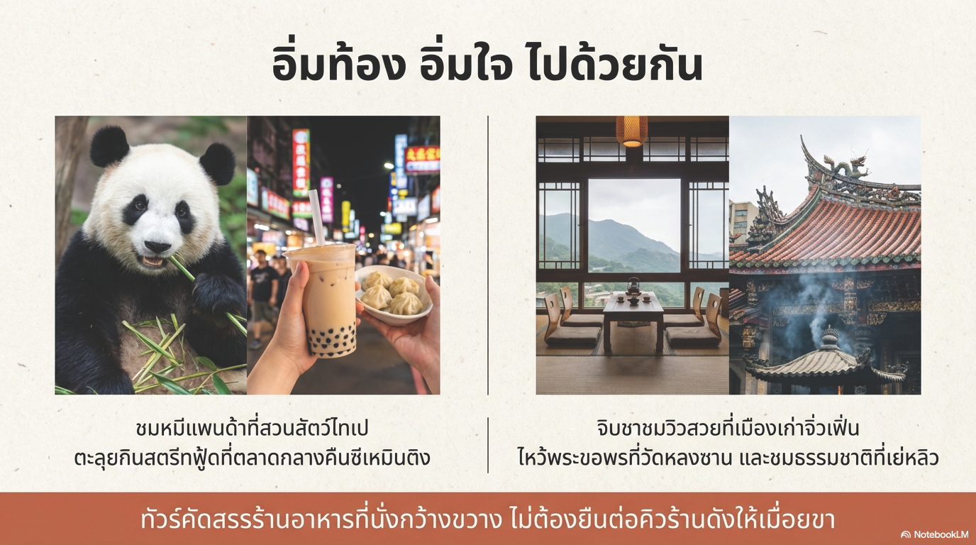ไต้หวันเป็นการผสมผสานระหว่างความทันสมัยของเมืองไทเปกับความงามทางธรรมชาติที่เงียบสงบ สำหรับผู้ใหญ่ การได้ไปนั่งจิบชาชมวิวที่เมืองเก่าจิ่วเฟิ่น หรือไปไหว้พระขอพรที่วัดหลงซาน ถือเป็นกิจกรรมที่ช่วยฮีลใจได้ดีมาก ส่วนเด็กๆ ก็จะสนุกไปกับการเลือกทานสตรีทฟู้ดที่ตลาดกลางคืนที่มีให้เลือกมากมาย หรือไปเที่ยวสวนสัตว์ไทเปที่มีหมีแพนด้าสุดน่ารัก