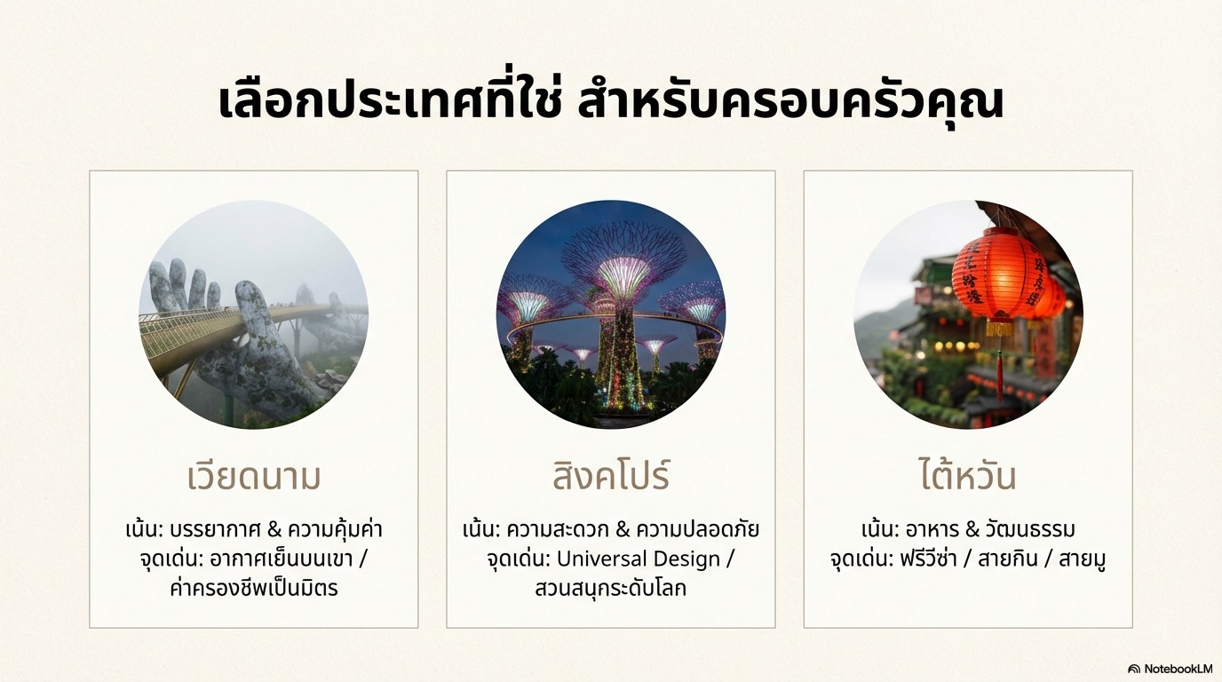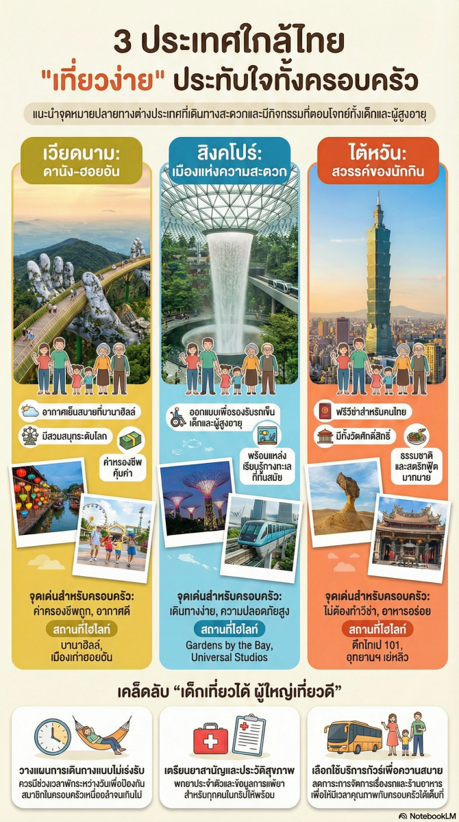 เลือกใช้บริการทัวร์: สำหรับครอบครัวใหญ่ การเลือกซื้อแพ็กเกจ ทัวร์เวียดนาม, ทัวร์สิงคโปร์ หรือ ทัวร์ไต้หวัน มักจะสะดวกกว่าการเดินทางเอง เพราะมีคนคอยประสานงาน จัดการเรื่องรถ การจองตั๋วเข้าชม และร้านอาหารให้ครบวงจร ทำให้เรามีเวลาอยู่กับครอบครัวได้อย่างเต็มที่